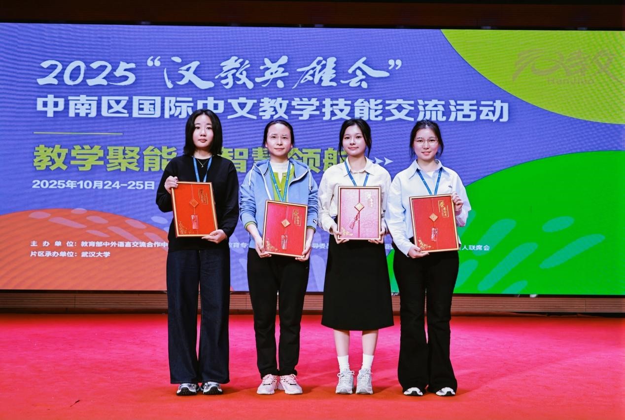 2025年10月25日,我院汉语国际教育专业学生团队应邀赴武汉大学,参加“汉教英雄会”(中南片区)国际中文教学技能交流活动。团队凭借扎实的专业功底与富有创意的教学设计,荣获“优秀教学实践团队”称号,为学院争得荣誉。