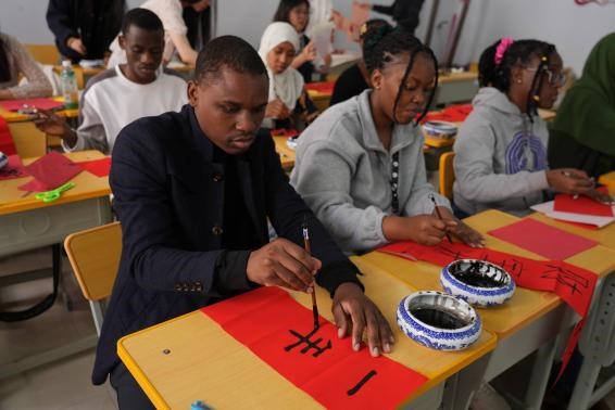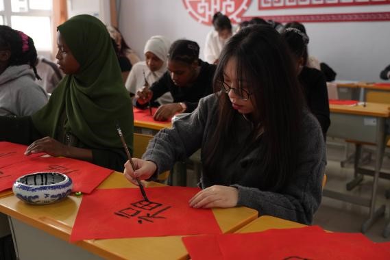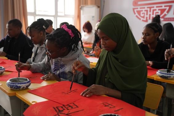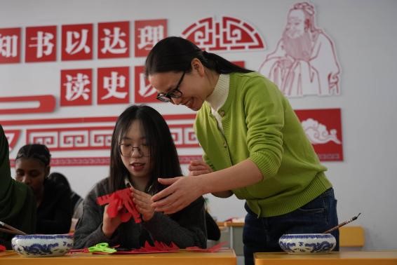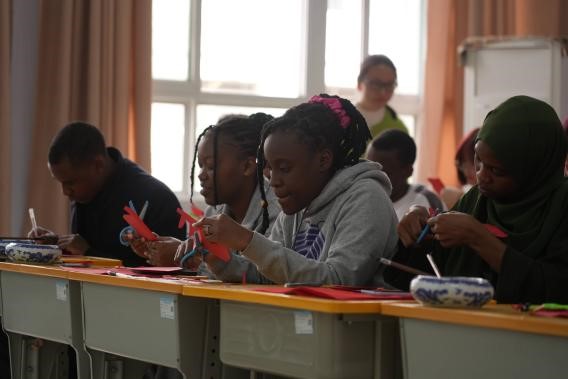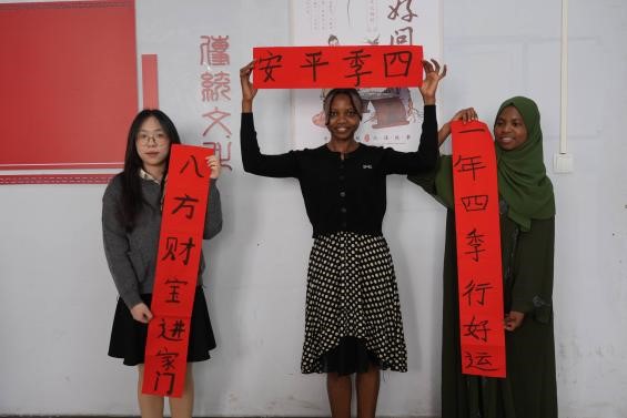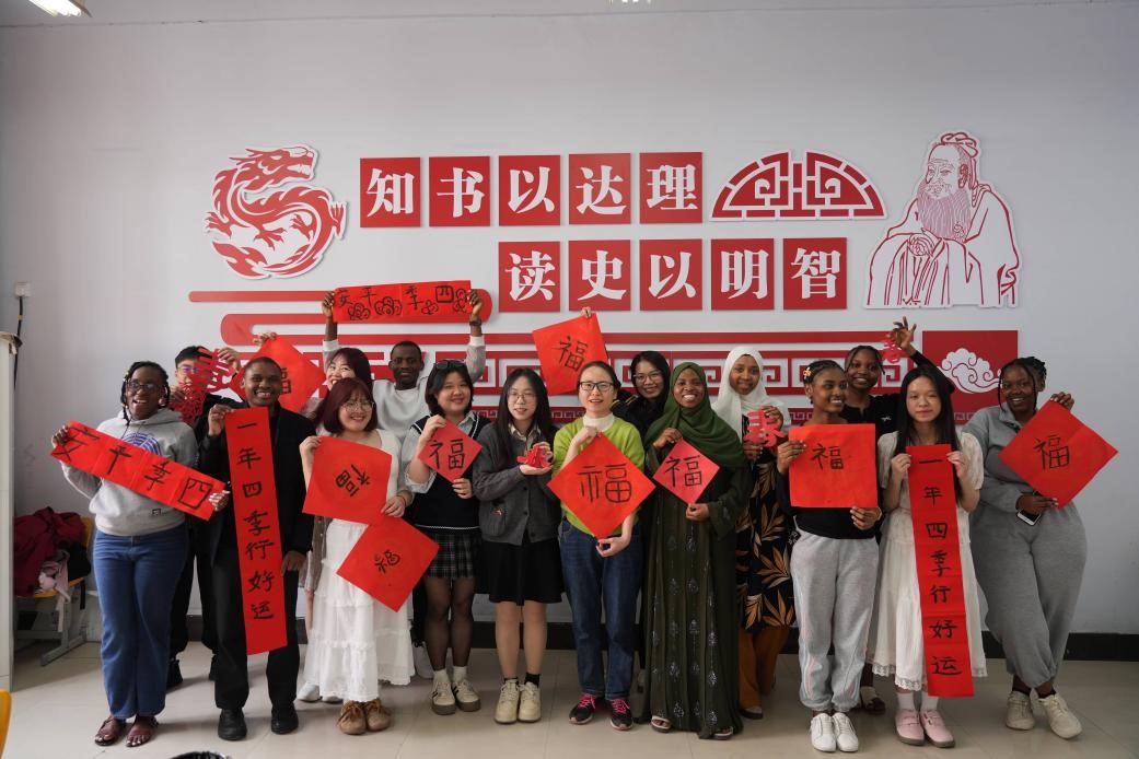 随后,在刘淼老师的带领下,留学生们兴致盎然地体验了写“福”字、写春联、剪窗花等春节民俗活动。坦桑尼亚姑娘第一次用剪刀剪出"春"字窗花,越南学生和伙伴合作完成"四季平安"对联,坦桑尼亚小伙举着倒"福"字自拍:"我要把中国福气寄回家!"