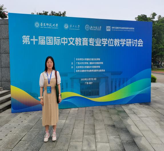 2025年11月7日至9日,第十届国际中文教育专业学位教学研讨会在广西大学隆重举行。本届研讨会汇聚了全国国际中文教育领域的顶尖专家学者与青年学子,共同探讨专业发展新阶段面临的机遇与挑战。我院国际中文教育专业一年级研究生谢炎应邀参会,并在分会场作专题报告,展现了我校学子的专业素养与学术风采。